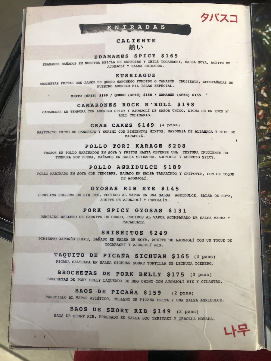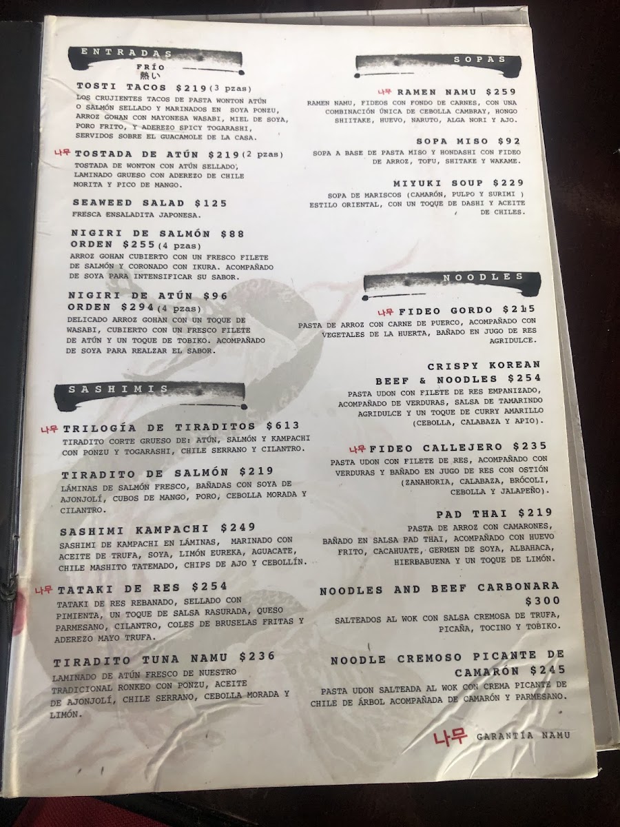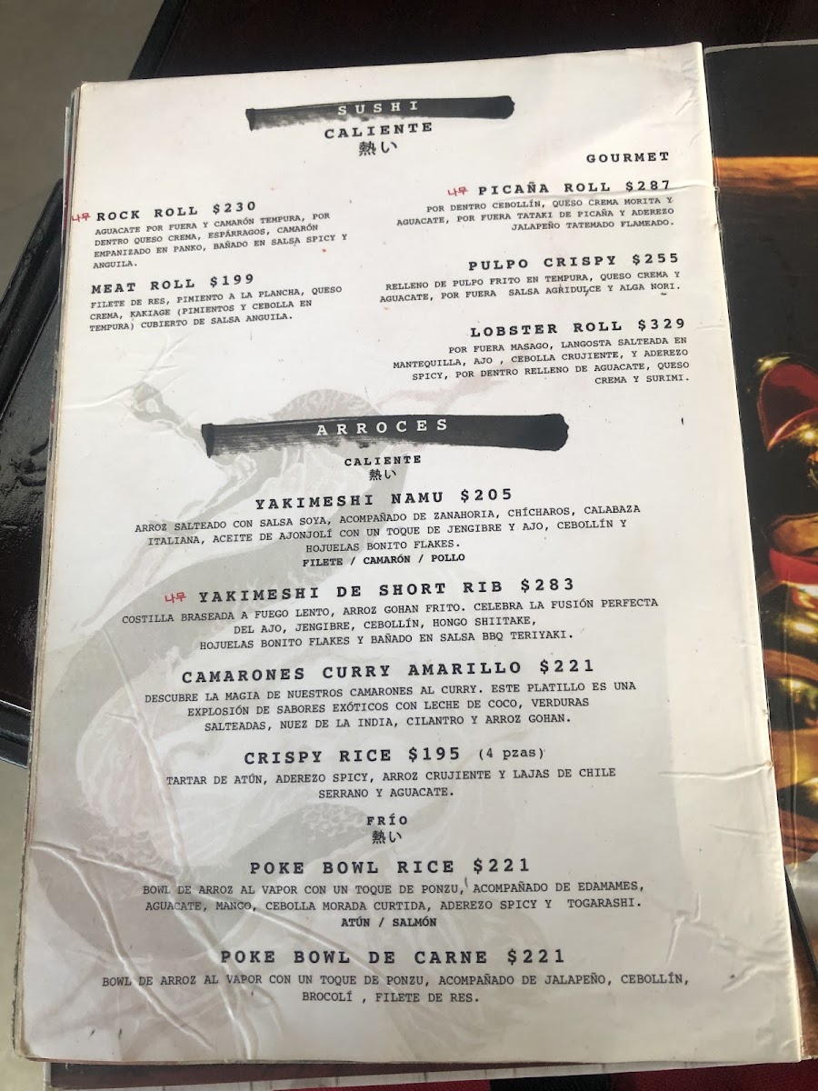 The menu at Central Namú offers a wide range of flavorful dishes, with an emphasis on sushi, rice, noodles, and unique appetizers. For sushi lovers, the Ebi Roll, Salmón Roll, and Uzumaki Roll Frito provide delightful options, while the Rock Roll and Salmón Crunch cater to those seeking a bit more crunch and innovation in their rolls. The Burger Namu is a standout for those craving a hearty burger, paired perfectly with the Sopa Miso. For rice dishes, the restaurant offers a variety of choices such as the flavorful Camarones Curry Amarillo and the delicious Yakimeshi Namu De Filete. The Yakimeshi variations, including Yakimeshi Namu De Pollo, Yakimeshi Namu Mixto, and Yakimeshi Namu De Camarón, offer something for every taste. For starters, guests can enjoy the spicy Edamames Spicy or the tempting Orden Kushiagues Mixto, with choices like Kushiagues De Camarón or Pollo Agridulce. The menu also includes a selection of noodles, from the comforting Fideo Callejero to the crispy goodness of Crispy Korean Beef An Noodles and the flavorful Fideo GordoPad Thai. For those who enjoy a fresh, cool dish, the Poke Bowl Rice Salmón and Poke Bowl Rice Atún offer a light yet satisfying option. The restaurant’s menu is diverse, offering a combination of traditional Japanese flavors with a modern twist, perfect for any occasion.